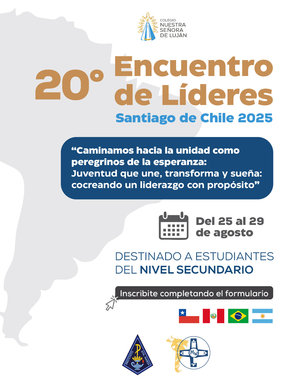 El Colegio Nuestra Señora de Luján (CNSL) tiene el agrado de anunciar a su comunidad una destacada oportunidad para sus estudiantes del Nivel Secundario: la participación en el 20° Encuentro de Líderes Estudiantes de la Red Amerindia, que se llevará a cabo en Santiago de Chile. Este importante evento se realizará en el Colegio Instituto Santa María de Santiago, entre el lunes 25 y el viernes 29 de agosto de 2025.