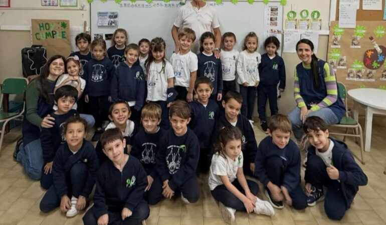 Los alumnos de la sala de 5 años recibieron la visita de Marcelo Marano, veterano de guerra oriundo de la ciudad de Luján, quien desde hace años reside en San Andrés de Giles. En un encuentro especialmente preparado, el excombatiente compartió con los niños su experiencia durante el conflicto bélico, en un espacio de diálogo adaptado a la edad de los estudiantes.