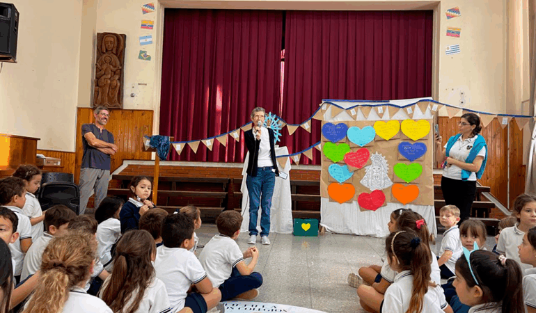 El especialista en desarrollo personal y educación emocional realizó jornadas musicales en las sedes de los niveles Inicial y Primario. Junto a las y los estudiantes, docentes y directivos; Prudenza presentó los aspectos más destacados de su libro, reflexionó sobre las pantallas y compartió su música con los presentes.